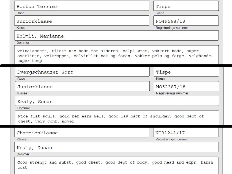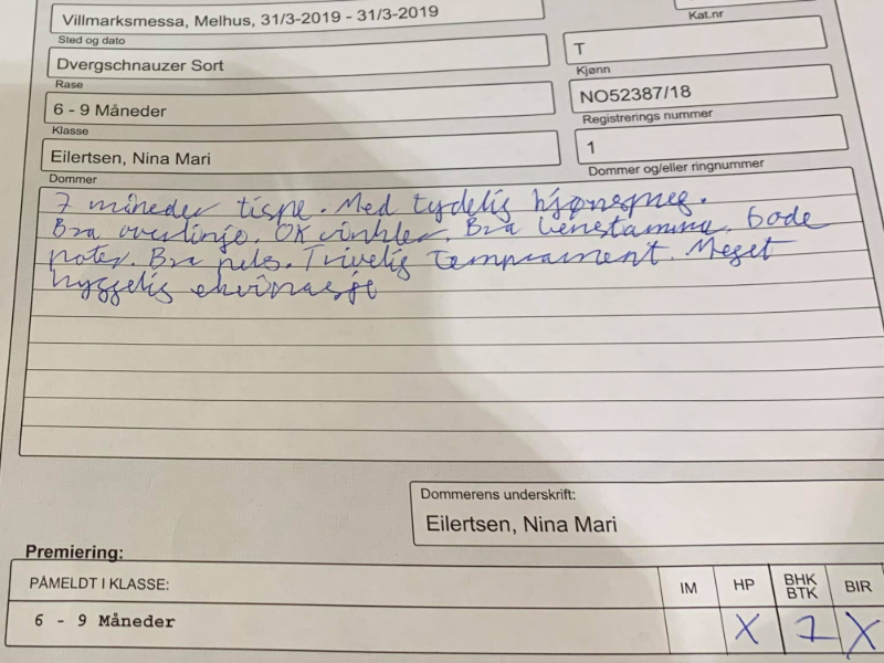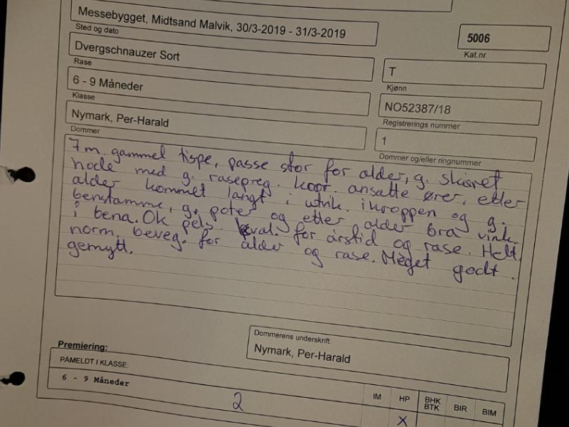 Det var i dag valpeshow på Messebygget Midtsand i Malvik, arrangør var Norsk Terrier Klub Trøndelag. Vi stilte med Boston Terrier Myra og Dvergschnauzer Nala. Myra ble BIR og Nala ble 2. BTK med veldig flott kritikk (legger ved bilde av kritikken til Nala)