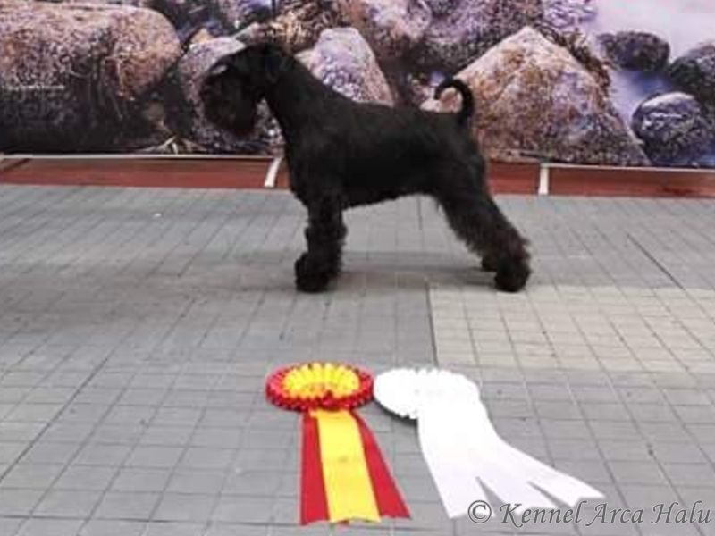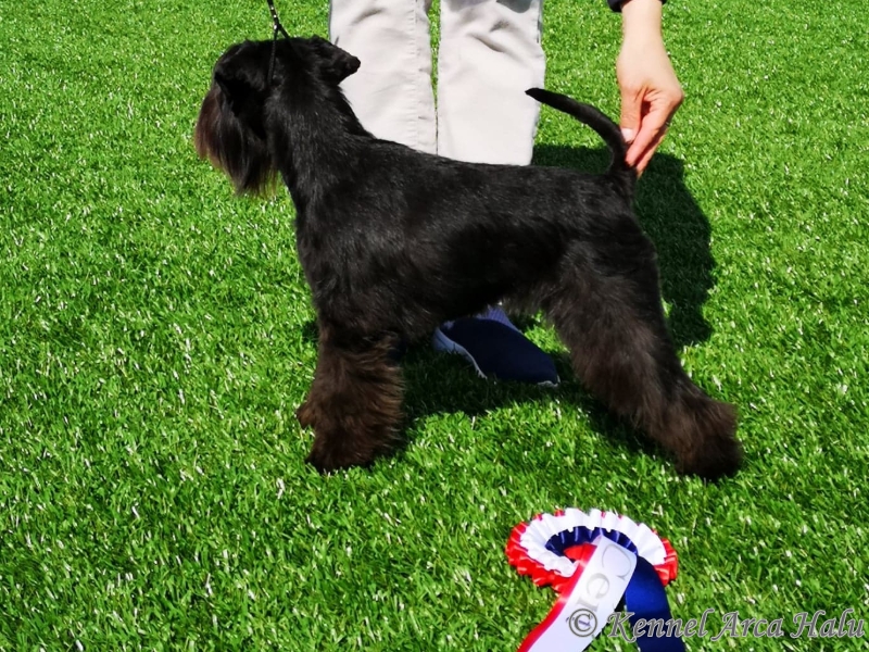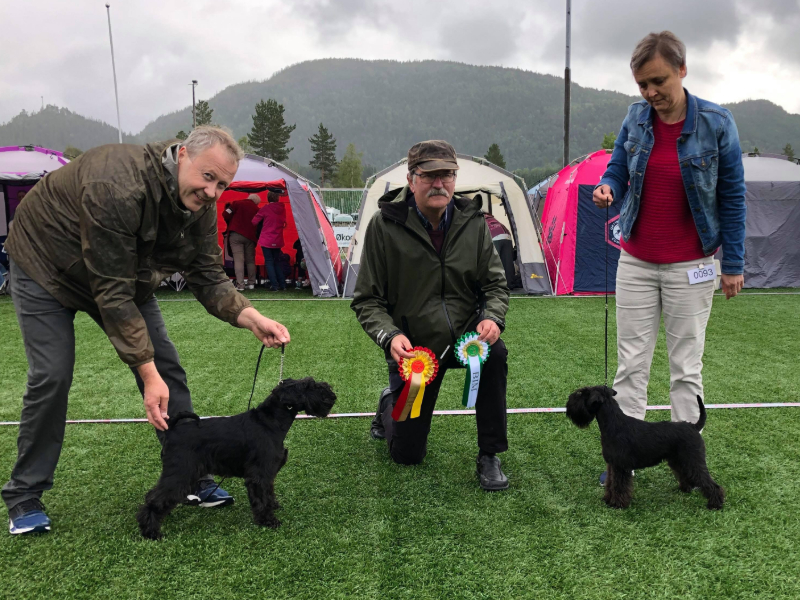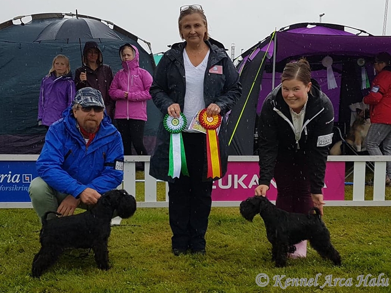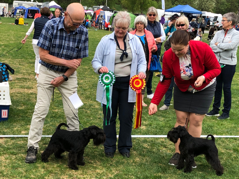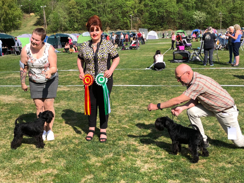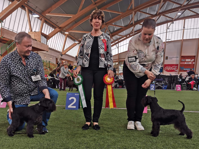 Det gikk veldig bra for Arca Halu i dag. Vi stilte to Dvergschnauzere, Nova ble 1.BTK og BIR med CACIB og Nala ble 2.BTK med CERT. Kjempeflott kritikk på begge to.